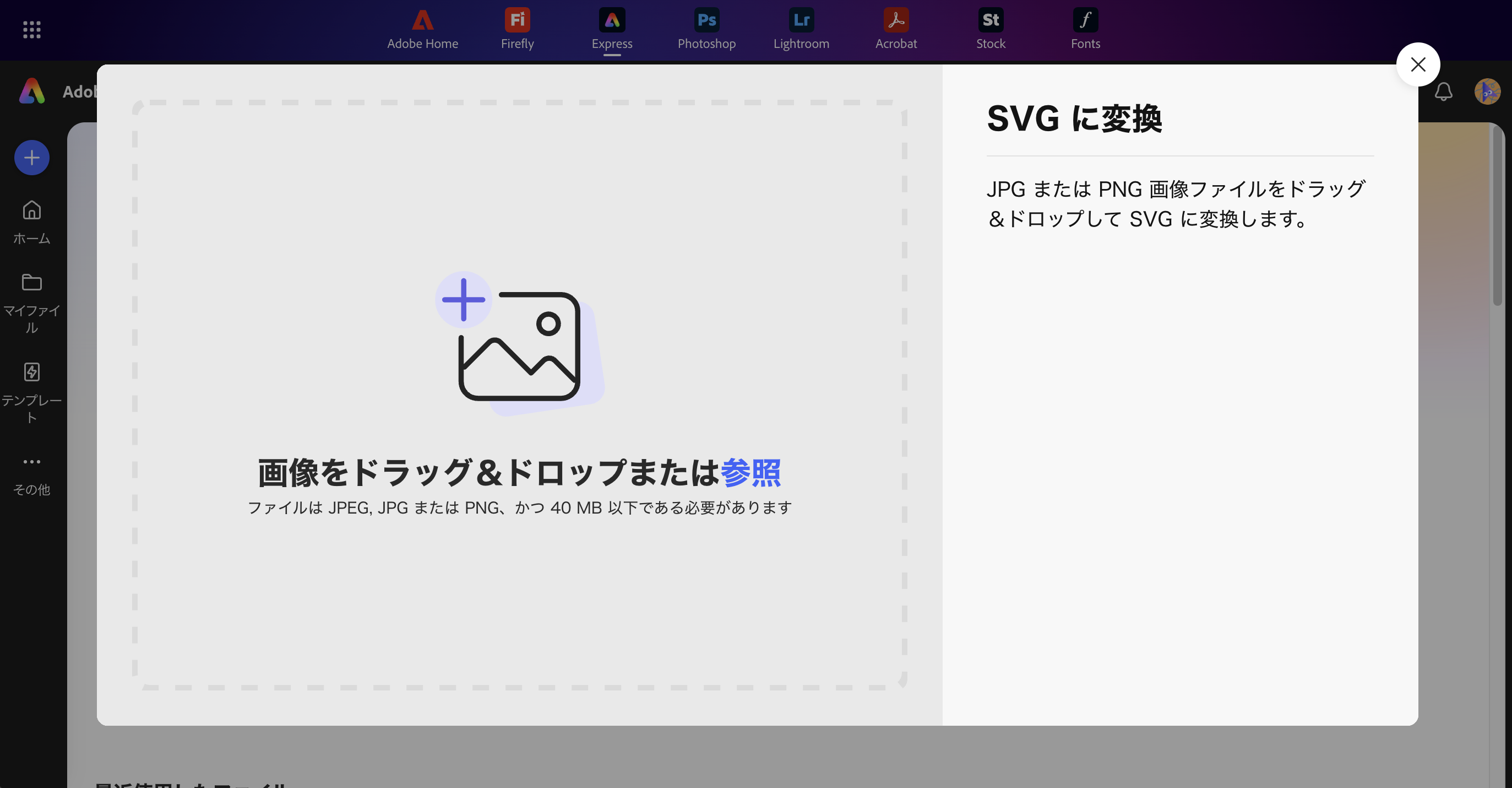今回は、Adobe Express(無料プラン)を使ってみます。「SVGに変換」という機能がありますので、ドラッグ&ドロップでイラストファイルを投げます。