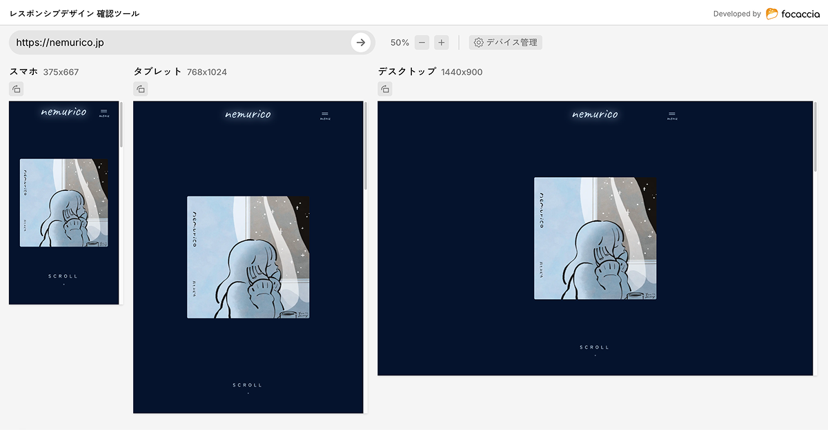 使い方は簡単で、見たいページのURLを入力するだけです。以下のように、3つの異なる画面サイズで確認することができます。